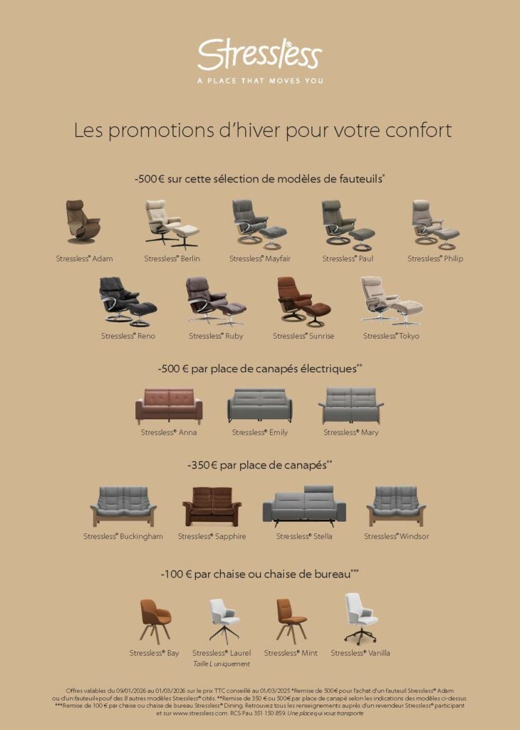 Les promotions Stressless d’hiver vous attendent à Sicomob, sur une sélection de fauteuils, canapés et chaises, du 9 janvier au 1er mars 2026